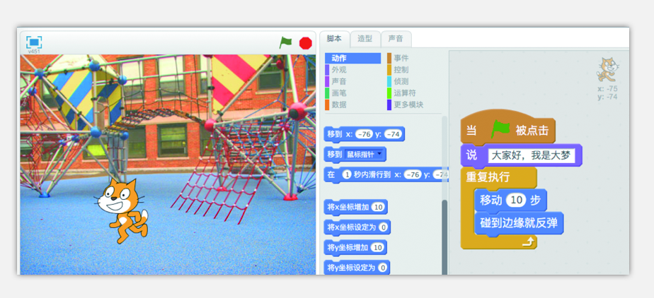 我在教孩子们学Scratch的时候,第一节课就是让上图中这只小猫左右跑。孩子们只需要告诉小猫:重复执行“移动10步”,如果碰到边缘就反弹回来。一个简单的小程序就这样完成了。