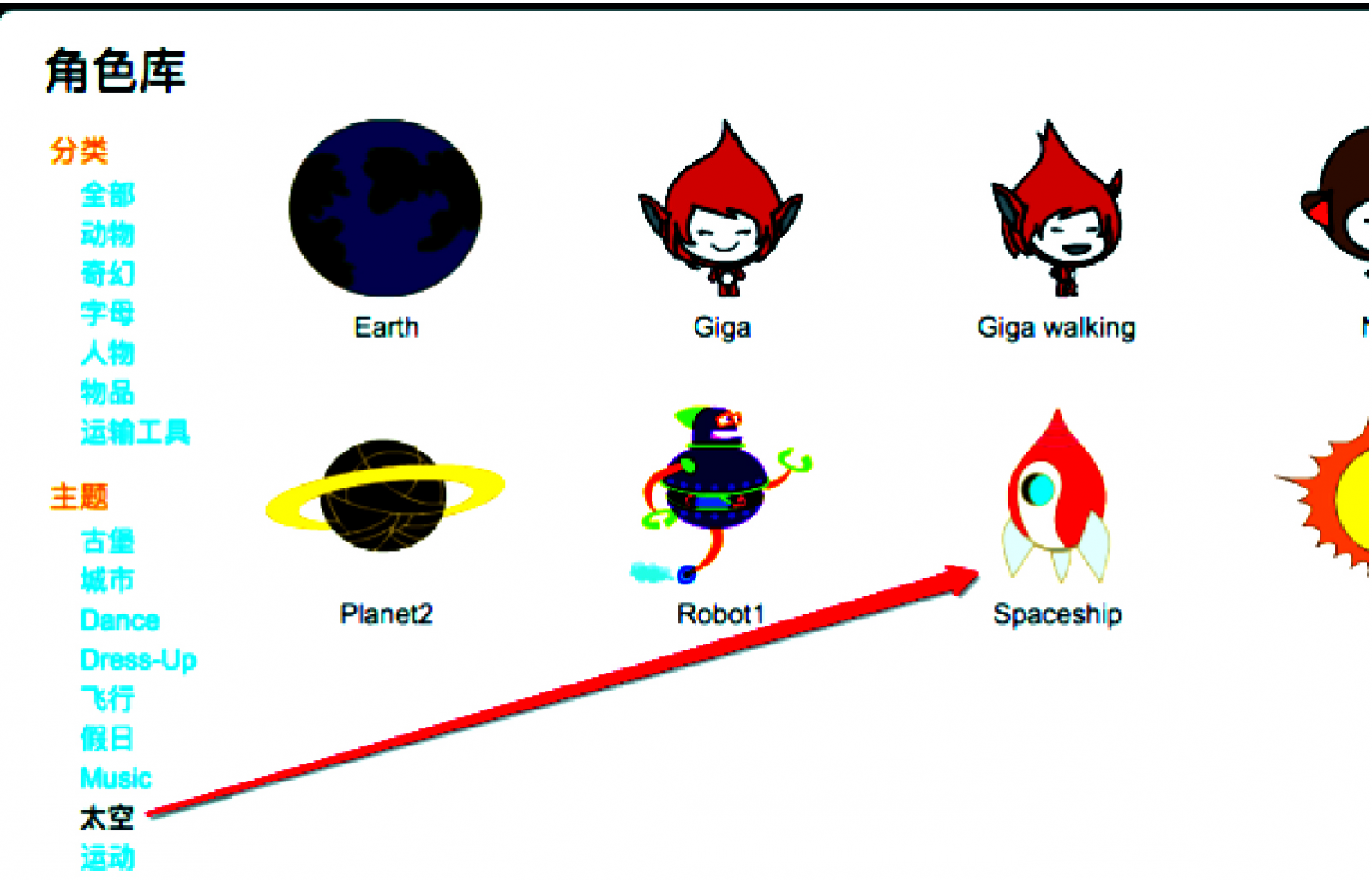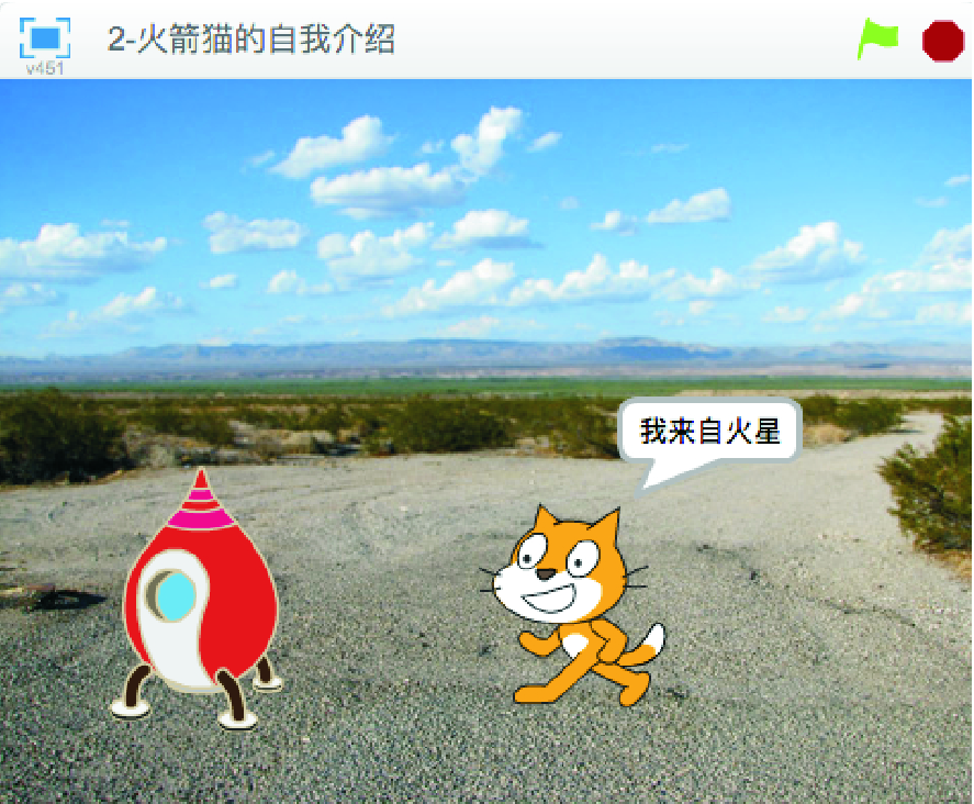 这里有两个角色,小猫和飞船,别忘记还有一个舞台哦!