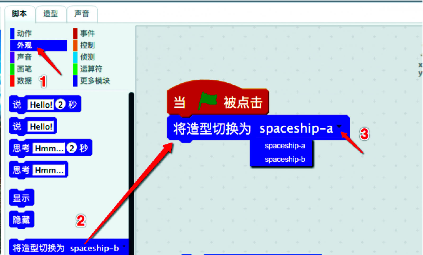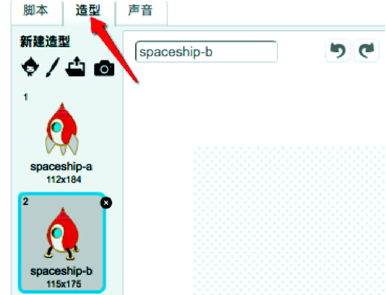 造型A是飞行的姿态,造型B是降落的姿态。根据我们之前的程序思路图,最开始应该让飞船以造型A的方式出现。(如图6)