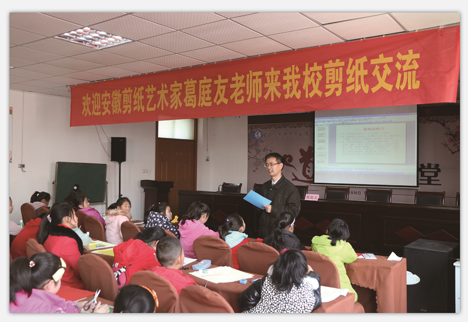 | 弘扬剪纸技艺传承文化遗产全国非遗传人、剪纸大师葛庭友参加宿迁高师一附小文化交流活动 |