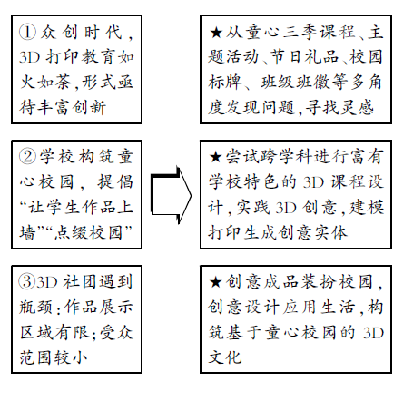 因此,笔者希望可以将STEAM理念与社团教学相结合,以STEAM教育思想为导向,以3D打印技术为依托,以激发学生兴趣、贴近生活为出发点,通过单元式的课题设计、多学科的知识融合、跨社团的交流学习等形式,构建富有学校特色的3D拓展性课程,期待在解决社团难题的同时,更积淀童心校园下的3D打印文化。