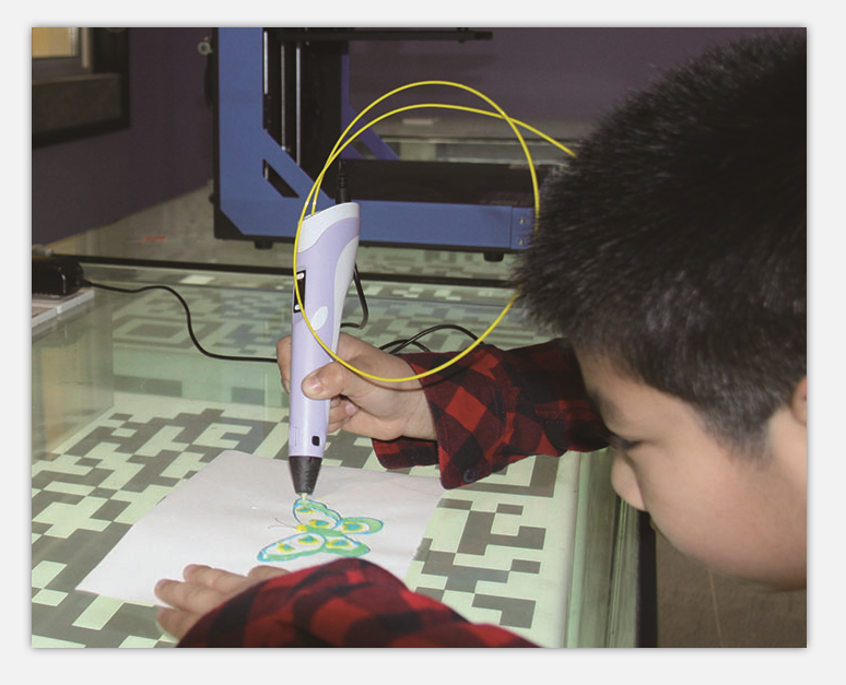 小学低年级学生还没有明确的三维空间概念,3D打印笔是最简单的入门工具。它无需电脑和软件的支持,学生只要将其插上电源,安装3D打印耗材,就可以开始作品创作。但由于笔尖和挤出的塑料耗材温度可能会达到200℃,建议学生在教师或家长的陪伴下使用。