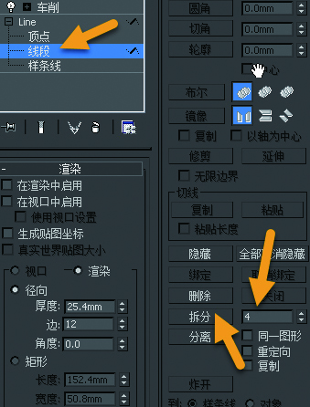 2.选中模型,在修改器中点击“Line—线段”,选择竖直的这条线段。找到“拆分”,将其右侧属性框数字改为4(如图10),单击“拆分”按钮。