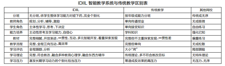 IDIIL智能教学系统与传统教学有着显著区别(如表所示)。DIIL智能教学系统可以充分挖掘学生的学习潜能,培养学生六大学习素养:专注力、积极性、自信心、思考力、独立性、自识力。