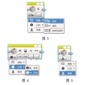 在EV3软件的陀螺仪传感器模块中,可以测量当前值(角度、速率、角度和速率,如图3),或者与设定值(角度、速率)比较,并输出结果(如图4),还可以将陀螺仪重置(如图5)。