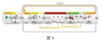 小车的原地旋转可以使用数学模块和移动槽模块使左右电机速度互为相反数;角度数据的实时采集以及左右电机在一定条件下的持续工作需要在循环中实现;当小车不断旋转直到测量角度重新为0时,左右电机速度也为0,即小车停止(程序流程如图9)。