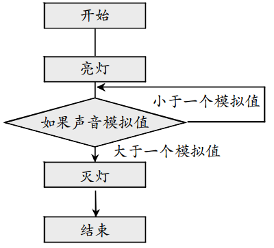 根据流程图中提示,设计一个电子蜡烛要分以下几个步骤:第一步要让一个灯亮起来模拟蜡烛,蜡烛的颜色和亮起的个数以及其他的显示效果由学生自行决定,这个任务应由项目策划的学生设计。第二步,如果一个声音的模拟值小于设定值就继续进行检测,如果大于设定值,就说明完成一个实验动作,转去执行关灯动作。第三步,关灯之后可以结束程序,也可以设计其他演示效果。