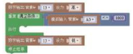 教师:每个Arduino学习实验板上的声音传感器反馈的数值不一样,但总体上对着麦克风吹风的数值要远远大于正常说话的数值。我们正是利用了这个特点,通过编写程序来判断,如果满足这个条件就执行LED的熄灭,并设计了很炫的熄灭效果。