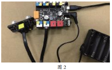 指导学生认识Makeblock主控、超声波传感器,了解各个接口的作用和功能,根据原理图和主控器端口的颜色进行传感器连线,依次连接电脑和小音箱。注意提醒学生看清端口,避免接错损坏硬件(如图2)。然后将超声波传感器、主控器和电源粘到设计好的外形KT板上。