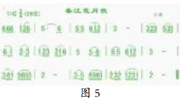 出示《春江花月夜》乐谱(如图5),让学生哼唱,观察前4个小节,设问:如果用刚才制作的乐器弹奏是否能实现?学生总结发现:(1)乐谱多出了2个音符,琴键和脚本必须要增加对应的部分。(2)乐谱中的节奏不统一,小组内演奏无法完成,可能需要多组合作。