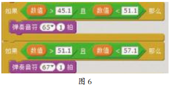 针对多出的2个音符,根据前面琴键间隔再画出2个琴键,并且添加如下脚本(如图6)。为了适应节奏的变化,建议小组间多次配合练习,每组负责一个音符的弹奏,经过几轮磨合,能将《春江花月夜》初步弹奏出来。