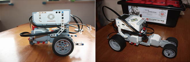 图1 部分学生改造方案1 说明:去掉左图中原始的万向轮,在相同位置增加第三个马达(如右图),并改变轮胎的大小。
