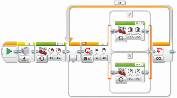图4 部分学生程序2 说明:程序启动后,首先重置陀螺仪传感器(2号端口),车辆的两个马达(B+C端口)以50%的功率前进,当陀螺仪传感器(2号端口)测得的角度数据大于15°时,车辆的两个马达(B+C端口)以100%的功率前进,否则继续以50%的功率前进,保存动力。