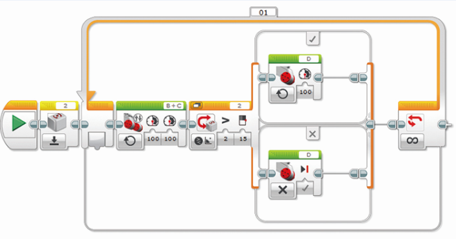 图5 部分学生程序3 说明:程序启动后,首先重置陀螺仪传感器(2号端口),车辆的两个马达(B+C端口)以100%的功率前进,当陀螺仪传感器(2号端口)测得的角度数据大于15°时,启动车辆的第三马达(D端口)以100%的功率前进,否则D端口马达不启动。