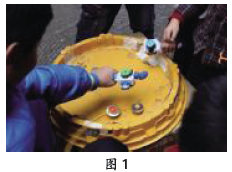 教学过程 一、聚焦任务,制作一个能转起来的陀螺 1.谈话导入 师:你们玩过陀螺吗?怎么玩的?(教师出示陀螺游戏图片,如图1)