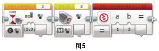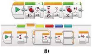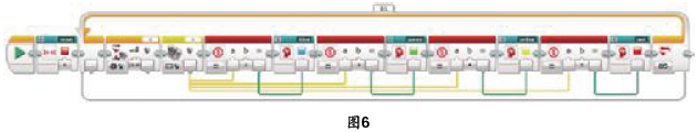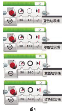 2.程序设计 整个程序主要分为两个模块。第一个模块是识别判断,通过颜色传感器识别到的颜色数值和程序内部预留的颜色数值进行比较匹配(如图5)。第二个模块是“垃圾颜色块”的分类动作,分类动作采用分支结构,程序根据颜色传感器识别到的颜色数值执行对应编号的分支程序,在不同的分支程序中执行不同的电机旋转命令,从而到达不同颜色垃圾桶的位置,完成分类工作(如图6)。最后将两个模块及其他模块嵌套“循环”结构,使智能垃圾分类机可以重复执行识别传送工作。