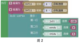 通过已学知识,启发学生完成控制温湿度传感器并将所测量的数值显示到OLED液晶显示器上的方案。(如图2)