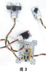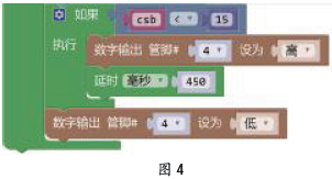 学生总结:“8”引脚获取湿度和温度数值,分别赋值给“S”和“W”两个不同的变量,通过OLED液晶显示器显示出来。 实验二 通过超声波距离控制,实现距离矫正 1.教师通过图示先为学生讲解超声波模块的工作原理和模块的接线用法,使用注意事项等问题,再结合超声波模块的工作原理给学生分析如何编写程序。(如图3)
