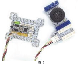 教师总结:如果超声波距离小于15cm,引脚“4”输出高电平,蜂鸣器发出提示声音,否则蜂鸣器不做出任何提示。学生可以根据自身差异,对距离数据进行微量调整,完成“私人定制”。 实验三 定时温馨提醒,防止用眼过度 1.通过图示向学生介绍语音播报模块和扬声器模块的用法,并指导学生完成模块之间的连接和主板的连接。(如图5)