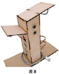 四、课后总结 师生共同回顾本节课所学内容,拓宽学生思维:超声波、温湿度等传感器还可以使用在生活中的哪些方面?如何与其他开源硬件更好地进行匹配? 五、作品展示 本节课是智能台灯的“智造”中的程序控制,这个作品的创客理念是让学生动手操作,利用所学知识解决生活中的问题。整个过程学生了解和掌握了不同传感器的功能及其应用,制作过程中学生还了解了激光切割机的工作原理,做出了作品的外观。(如图8)