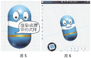 3.将组合后的实体和绘制好的两只眼睛实体进行组合减运算。 4.将眼睛及缩小部分渲染成白色。渲染时选择“曲面”。 5.绘制黑眼珠。选择球体工具,直径为2mm,渲染成黑色。利用镜像工具,复制另一个眼珠。 三、绘制腰带 选用“直线”工具,在“初始平面”上绘制直线将腰部进行“实体分割”,并进行渲染。(如图5)