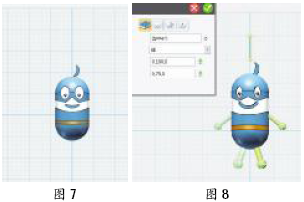 六、绘制四肢 1.利用圆柱及圆球工具绘制四肢,并移动位置达到美观。 2.选用移动工具中的“动态移动”,勾选“只移动手柄”,将手柄推到腋窝处,去掉“只移动手柄”复选框中的√,将手臂转到右下方。选用“球体”工具绘制拳头。 3.随后用同样的方法绘制腿和脚。选用“镜像”工具,完成另外一半的肢体。(如图8)