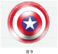 1.在旁边空白位置绘制一球体,绘制直线按1:2进行实体分割,删除下面 2.将盾牌移动旋转90°,在“初始平面”上绘制3个半径不同的圆,退出编辑状态。 3.对盾牌进行实体分割。对分开的几个实体分别渲染成红色、白色、红色、蓝色。 4.在中间一个圆里绘制五角星,投影和镶嵌曲线,渲染成白色。(如图9,注意:在这里镶嵌曲线时要选择方向,五角星才能完整地显示出来。)
