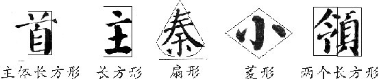 初学写字如同绘画,要注意对字形的把握。常用的方法是几何图形法,即引导学生把单字、单字的组成部件或单字主体部分加上几条简略的外部轮廓线,组成几何图形来分析字形、形成例字总体印象的方法。如以下汉字: