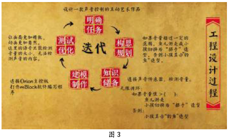 结合古诗所创设的意境,想一想,我们怎样去构思这个动画。如果来了一个路人,小孩会做出什么样的反应?如果路人发出很大的声音,鱼儿会怎样动起来?老师今天还准备了声音传感器,它能够检测到音量的大小。如果我们把声音传感器也加入到作品里面去,可以制作出什么样的效果呢? 这个创意太好了,如果检测到了声音,我们可以让小儿做出“遥招手”的动作,还可以让鱼儿受惊快速地游走。这样屏幕前的我们就变成了古诗中所说的“路人”了,我们也成了这幅画的一部分。这就不是一个普通的动画,它变成了一件互动的艺术品了。 【评析】将声音传感器与国画结合起来,设计一款互动的国画作品,使得STEM项目具有了丰富的文化内涵。教师是教学活动的组织者,不能将自己的想法强行灌输给学生,而是要引导学生去发散思维。STEM教学活动中,学生的创意与头脑风暴是其中重要的环节。这个过程让每一个人思维都能得到最大限度的开拓,有效地开阔思路、激发灵感,它能够激发学生持续不断的创造创新。 2.提出真实问题情境并引导学生探索 今天,我们来研究基于声音控制的互动艺术作品设计。 (教师呈现课题:基于声音控制的互动艺术作品设计。) 大家思考一下,这件融合现代技术与古典文化的作品可以用在哪些场合?它可以用在四年级的语文课堂上,更好地呈现诗歌的意境,让同学们爱上语文;可以用来装饰客厅,既美观又有文化内涵;可以放在博物馆,传播传统文化。 【评析】STEM教学强调要基于真实的问题情境,将学习过程与实际应用结合在一起,从真实的问题情境出发。教师要善于发掘问题蕴含的真实情境,让学生利用多学科的知识积极探索。问题成为贯穿整个学习过程的主线,把问题转化成一系列的学习任务,让学生达到对知识的深层次理解。 3.作品设计过程 工程师们设计一个作品,一般经历这样的过程:明确任务、构思规划、知识储备、建模制作、测试优化。由此,我们得到了设计声音控制互动艺术作品的工程设计过程,如图3所示。
