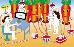 造血胡萝卜 苏州市吴中区越溪实验小学 陆宸吉 整幅画都运用了程序自带的画图软件来绘制。主要用铅笔、直线、曲线、刷子、方形和圆形来创作,还有颜料填充工具填色。最得意之处是在PS中对背景设置了渐变色,使画面更有层次感。 现在医院血库都很紧张,光靠献血是远远不够的,我希望可以利用胡萝卜来解决血库告急这个问题,也希望科学家和医学家能够研究和发明造血技术,充分利用身边的果蔬来造血,造福人类。