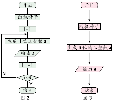 教师布置任务:如何让计算机生成并显示数字验证码? 2.化归为算法问题 教师引导学生思考并回答短信验证码的共同特征,即“6位正整数”,其后组织学生以小组为单位设计算法。 方法1:每次生成1位随机正整数,重复6次,流程图如图2所示。