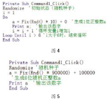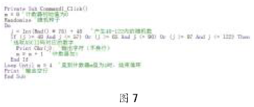 (二)字符验证码(随机数→字符) 1.程序背景 教师展示验证字符的截图,并简要介绍:“验证字符在页面的验证码输入框附近以图片的形式展示,此类验证码一般由4个字母与数字混合组成。” 教师布置任务:如何让计算机生成并显示4位数字、字母组合的字符? 2.化归为算法问题 教师阐释思路:让计算机随机产生4次随机数,每次选取的随机数要符合数字、字母对应ASCII码范围(48~122),并将其转化为ASCII码字符输出。 其中,字符“0~9”对应的ASCII码值为48~57;“A~Z”对应的ASCII码值为65~90;“a~z”对应的ASCII码值为97~122。 3.字符验证码程序实现 “验证字符”的最终程序界面如图6所示,VB编程代码如图7所示。