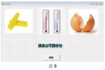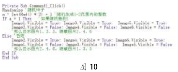 教师布置任务:随机生成3张图片,点击刷新,随机更换图片。 (二)化归为算法问题 教师阐释思路:1.将程序界面划分为3个区域,每个区域叠放2张图片。2.设置范围1~2的随机函数,当抽到“1”时,显示图片1、3、5,隐藏图片2、4、6;当抽到“2”时,反之。3.点击“刷新”,切换图片。 (三)图片验证码程序实现 “图片验证码”最终程序界面如图9所示,VB编程代码如图10所示。