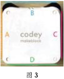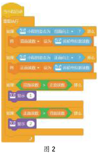 学生编写程序并下载到小程机器人,抛硬币测试效果,发现该程序存在缺点:游戏时,齿轮电位器必须拨到指定范围,导致操作者手指动作幅度较大,容易被识破。 3.算法设计——根据齿轮电位器拨动方向做出判断 根据前文出现的问题,修改算法,重新设定规则:小程的姿态变为“正面向上”时,如果齿轮电位器是向下拨动,屏幕显示“1”,即表示硬币正面朝上;如果齿轮电位器是向上拨动,屏幕显示“2”,即表示硬币反面朝上。 设计要点:使用控制模块下的“重复执行”实现对齿轮电位器读数与小程的姿态进行持续监测;使用两个变量分别记录小程的姿态为“背面向上”和“正面向上”时,齿轮电位器的读数;使用控制模块下的“如果……那么……”和运算模块下的相应运算比较两个变量的值,进而实现对齿轮电位器拨动方向的判断——如果“背面向上”时的读数小于“正面向上”时的读数,说明是向上拨动齿轮电位器,反之则说明是向下拨动齿轮电位器。具体程序编写如图2。