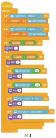 设计要点:使用控制模块下的“重复执行”,实现对齿轮电位器读数、翻滚角角度进行持续监测;使用控制模块下的“如果……那么……否则……”与“如果……那么……”的嵌套,实现对六种情况的甄别。 通过齿轮电位器的读数变化区分1、2两种情况。通过对翻滚角角度数值进行判断,区分3、4两种情况:如果翻滚角角度大于50,说明小程经历过以A边为轴,水平向左翻面的过程;如果翻滚角角度小于-50,说明小程经历过以C边为轴,水平向右翻面的过程。通过对小程“耳朵向下”倾斜与小程的姿态为“直立在桌面”进行判断,区分5、6两种情况:如果小程“耳朵向下”倾斜,说明小程经历过以B边为轴,垂直向上翻面的过程;如果小程的姿态为“直立在桌面”,说明小程经历过以D边为轴,垂直向下翻面的过程。程序编写如图4。