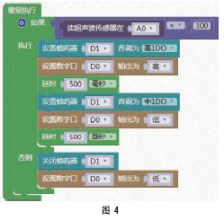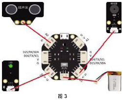 (二)模块接线 将超声波模块、蜂鸣器模块、LED模块和“好搭酷mini”进行连接:超声波模块接在A0接口,LED模块接在D0接口,蜂鸣器模块接在D1接口,锂电池接在电源接口,如图3。