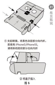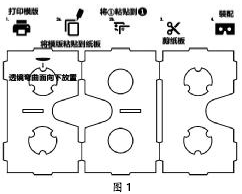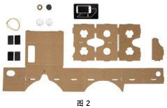 (二)制作步骤 1.下载并打印谷歌Cardboard 1.0图纸模板(打印时尽量使用彩色打印机)。 2.将打印好的图纸粘贴到同样大小的瓦楞纸上,进行剪裁,参考图2组装图纸。