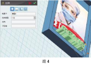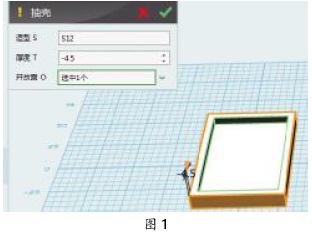1.长方体的实体建模,进行长、宽、高的参数设定,调整为最佳视觉效果的模型比例。 2.利用“抽壳”将长方体内部掏空,注意边框的保留厚度,引导学生思考合适的厚度值,如图1。