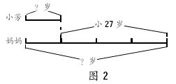 学生找到的规律不能局限于“前一个图形的根数+2”,而应该找出“1+2N”(N表示要搭的三角形的个数)这样的规律,甚至可以反过来思考:张元硕同学一共用了81根火柴棒,请问他搭出了多少个三角形? 层层递进的教学设计,让学生亲身参与探索和研究,参与到思考和辨析中来,学生的学习是深层次的,循序渐进,步步深入,这才是探索规律的必经之路。 三、让学生愿意“画图表” 审题是解决问题的基础和先导。数学教学中要让学生养成列表画图整理问题的好习惯,特别是对一些思考性较强的习题,更要让学生通过画图整理分析,找到解决问题的关键。 案例3:小芳比妈妈小27岁,妈妈今年的岁数正好是小芳的4倍。妈妈和小芳今年各多少岁?(苏教版教育部审定2013义务教育教科书三年级下册数学书第33页思考题) 首先,抓关键句,找准“倍数1”,即“妈妈今年的岁数正好是小芳的4倍”。