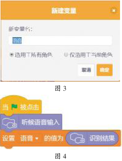 生2:接着,我们建立一个叫做“语音”的变量(如图3),将识别到的语音转换成汉字,再将这个值赋值给变量“语音”(如图4)。