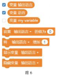 生4:接下来,我们新定义一个变量“输出语言”(如图6),用来存储翻译过来的文字。通过“谷歌翻译”积木中的“将……译为‘英语’”,将变量“语音”中的中文汉字翻译为英文,接着将英文赋值给变量“输出语言”。同样,我们也让这个变量显示出来。