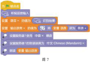生5:然后我们就可以使用“文字朗读”模块中的指令,将翻译过来的语句输出啦!为了输出效果更好,我们可以对“嗓音”和“输出语言”进行进一步的设置(如图7)。