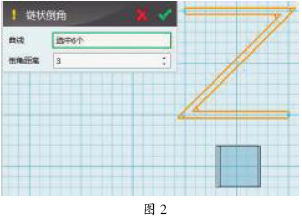 (2)选中Z形,使用“草图编辑”—“偏移曲线”,对其在两个方向偏移,偏移的距离为1.5。删除双线中间的单线Z形,使用直线封闭图形,然后使用“草图编辑”—“链状倒角”,对Z形拐角处倒角,倒角参数为3(如图2)。