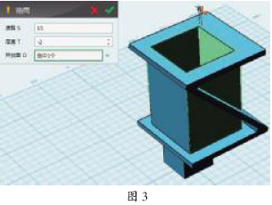 (4)使用“特殊功能”或者“快速工具栏”中的“抽壳”对箱体抽壳,抽壳的厚度为-2,开放面为箱体顶面(如图3)。