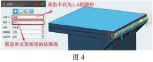 小组讨论制作合页过程并操作,教师巡视指导。 教师演示操作: (1)显示全部,调出杂物箱盖,制作连接支架和盖的活动轴,使用“草图绘制”—“圆形”,在支架和箱盖衔接边沿线上,绘制一个半径为1.5的圆形,然后对其“扫掠”(如图4)。