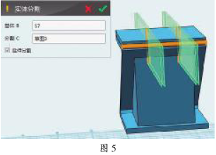(2)选中拉伸的柱体,按组合键Ctrl+C对其原点复制,然后使用“组合编辑”—“减运算”,对支架和箱盖进行减运算。 (3)选中柱体,对其抽壳,抽壳的厚度为-0.2,开放面为柱体的顶面和底面,呈管状。 (4)切换视图到右视图,使用“草图绘制”—“直线”,在六面体右面中心创建平面网格,绘制垂直线,对管状柱体进行“实体分割”,然后删除多余部分(如图5)。