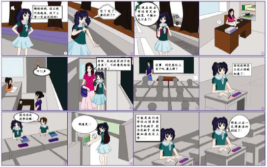 无微不至的关怀 宜兴市和桥镇第二中学钱湘裕 作品描绘的是一个小女孩因为迟到准备逃课时,学校刷卡系统发出警报,老师联系家长后由家长将女孩送到教室的场景,体现了智能时代学校对学生无微不至的关怀。我先在绘图软件上涂鸦人物,并添加与主题相关的文字,最后通过美图秀秀的拼接功能将12幅图拼接起来。