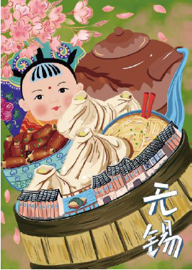 无锡印象 无锡市育英实验小学 陆彦冰 我的家乡无锡,是个充满魅力的城市,一年四季都有美丽的风景。每个人心中对它都有不一样的记忆:造型精美的惠山泥人、香甜美味的酱排骨、扬名于外的紫砂壶……每到春天,鼋头渚的樱花还会吸引成千上万的游客,景色美不胜收。作为一个无锡人,我感到十分自豪。 我的作品采用竖构图,巧妙地利用小笼包的笼屉作为载体,融入了无锡的特色。这幅作品的整体布局设计合理,画面饱满,背景的绿色和樱花的粉色相融合,更显无锡江南水乡韵味。