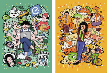 组图二以黄橙暖色调为基调,描绘了人们愈加丰富的精神生活。老年人爱跳广场舞,年轻人在工作之余去旅游、玩乐器、进社团,就连宠物也成为人们生活中不可或缺的一部分。 设计时,我先手绘草稿,将各种想到的小康生活元素堆叠,用云朵形和点线衔接各种元素;再将手绘草稿转入Procreate软件,用电脑手绘笔完成勾画、试色、上色等步骤。两幅作品的选色是我的得意之处。