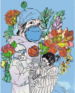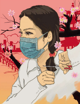 2020年新冠肺炎疫情暴发之时,有一群90后女医生、女护士奔赴战场,她们剪去了美丽的长发,穿上厚重的防护服,只为救死扶伤、守护国家,我有感而发创作了这幅作品。在绘制过程中,我使用了奇奕画王软件Wacom手绘板,将人物神态描绘得生动细腻,把医务人员面对疫情严谨的态度和无私奉献的精神表现出来。